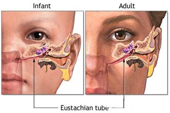 例如急性中耳炎通常都是由耳咽管感染的,通常在伤风感冒时,鼻腔粘膜发炎,活跃的细菌就会从鼻咽部的耳咽管开口直接进入中耳,引起中耳粘膜发炎,在青少年儿童时期,这种情况尤为多见。由于成人耳咽管细窄,弯曲且长,而青少年儿童则相反,咽鼓管短相对较粗,且呈水平方向,故鼻腔和鼻咽部细菌很容易侵入,以致造成急性中耳炎甚至急性化脓性中耳炎而影响听力。